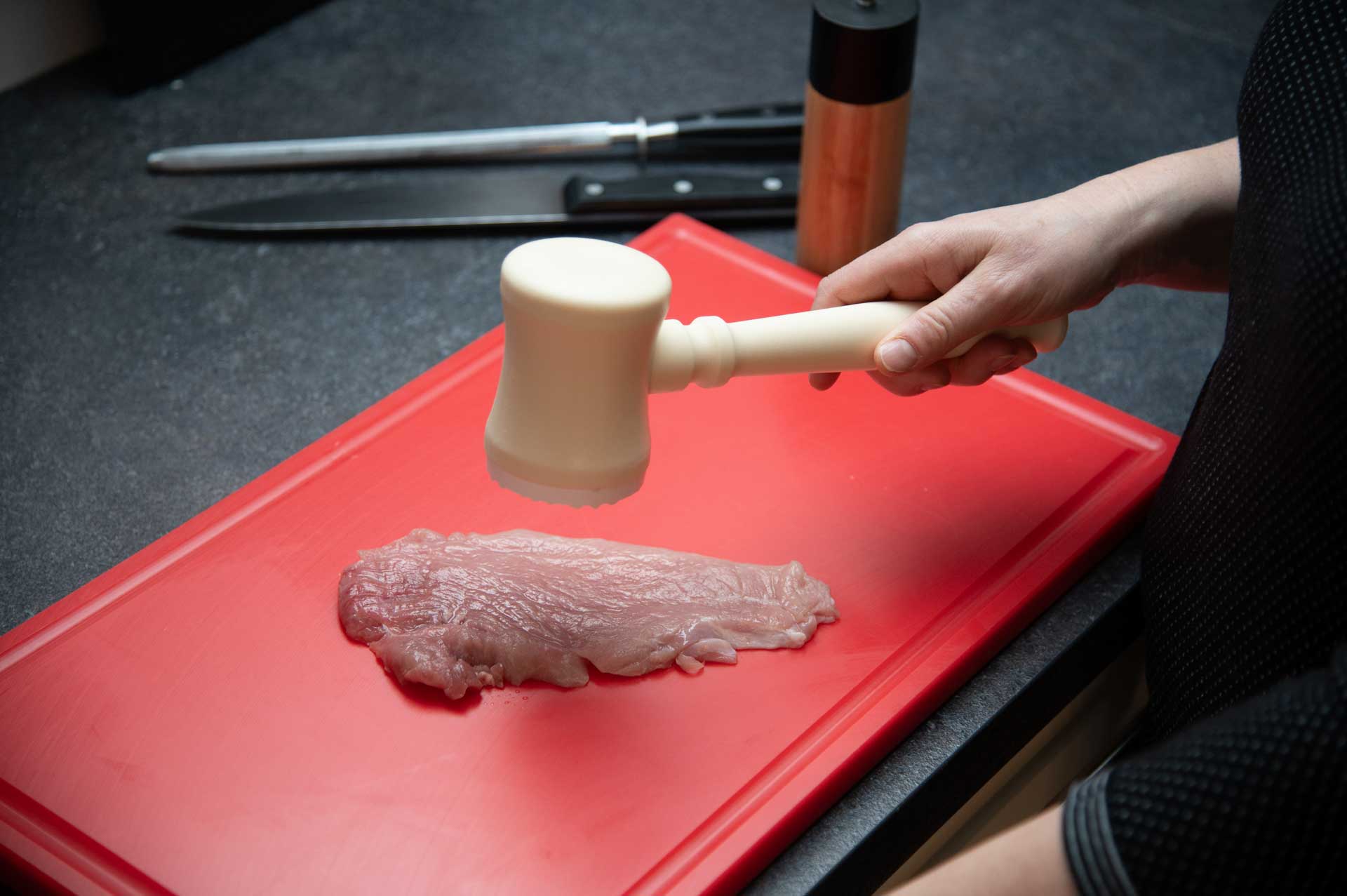 Die günstige Alternative. Hygienischer hochwertiger Haushaltsfleischklopfer hergestellt aus PP, schlagzäh, lebensmittelecht. Mit bruchfester langlebiger Riffelplatte aus lebensmittelechtem PA Kunststoff.