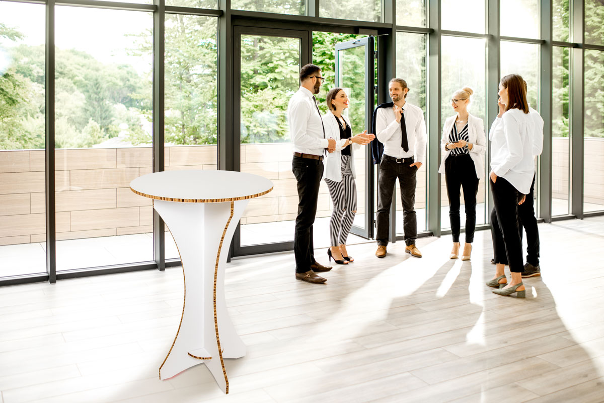 Stehtisch unbedruckt. Gefertigt aus Wabenkarton außen weiß, Kern braun. Ideal für Events, den mobilen oder kurzfristigen Einsatz. Stabile Konstruktion, einfacher und rascher Aufbau, wiederverwendbar, geringes Transportgewicht. Dazupassend Tischplatte aus Acryl siehe Artikel 502580 und Transporteinzelverpackung Artikel 700261.